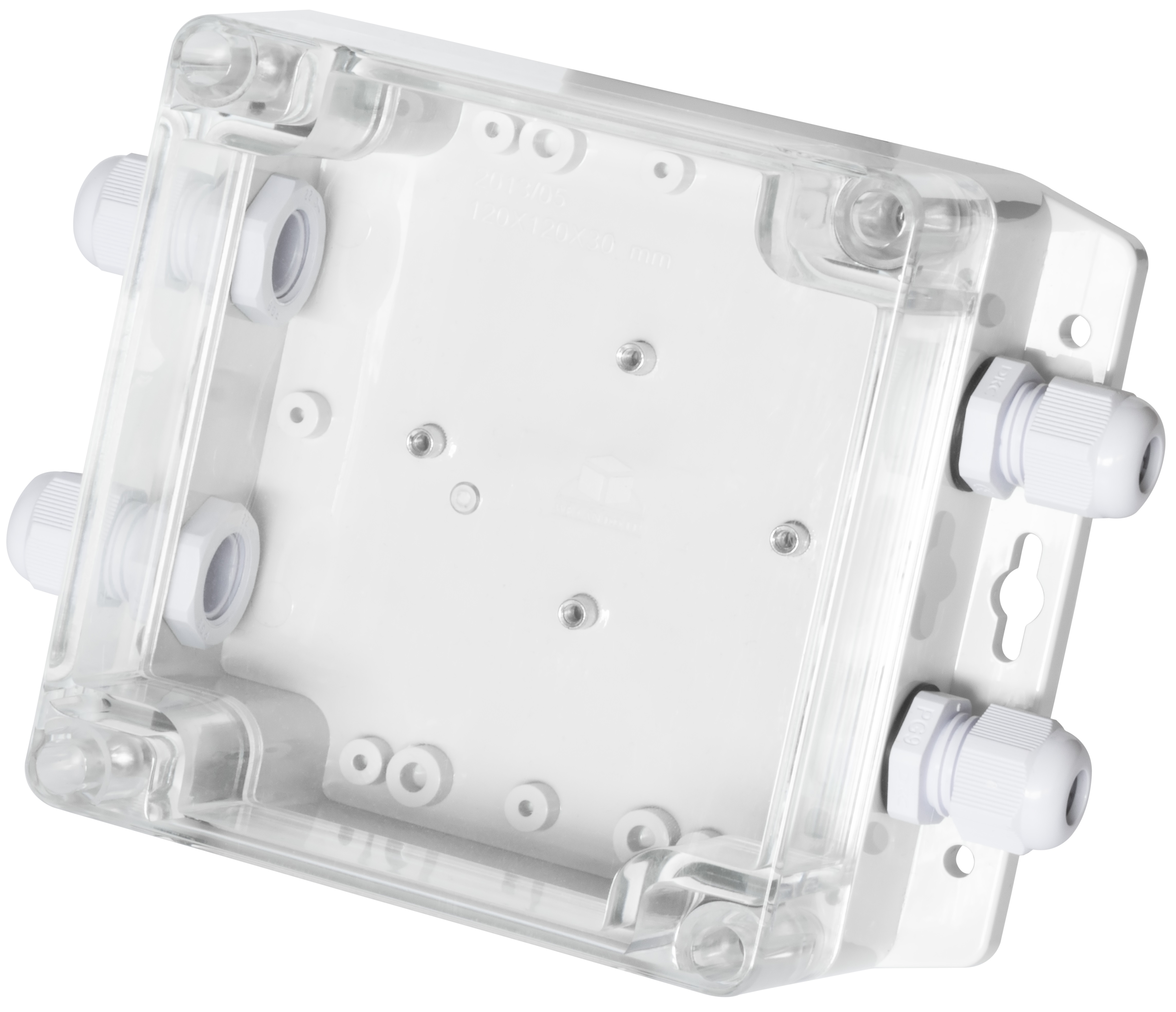 Влагозащитный корпус для ВУОСа 801824. Диапазон рабочих температур -40...+80 °С. Габаритные размеры: 130х130х50 мм. IP67.