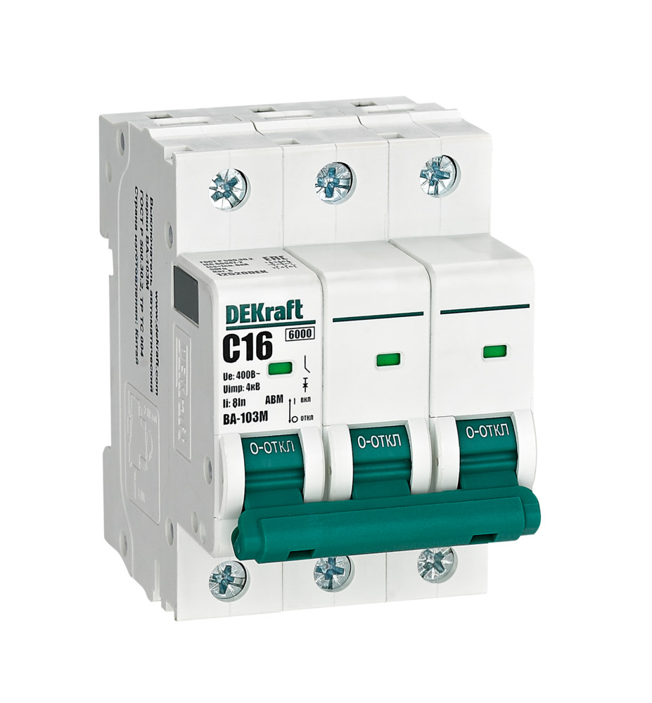 Автоматический выключатель без теплозащиты серии ВА-103M Dekraft; 3P; ном. ток 16 А; ном. раб. напряжение 400 В; кривая отключения C. Автоматические выключатели серии ВА-103М имеют специальное назначение для систем противопожарной защиты и вентиляции и выдерживают ток КЗ до 6000 А. Также они могут использоваться для нечастых оперативных включений и отключений указанных цепей. Автоматические выключатели соответствуют директиве RoHS, имеют расширенный диапазон рабочих температур от -25 до +60 °C, удобны и безопасны в эксплуатации.