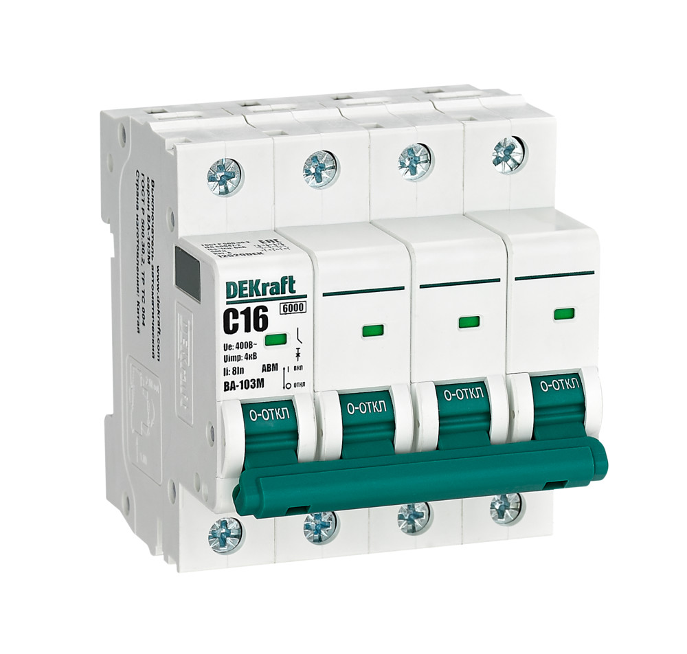 Автоматический выключатель без теплозащиты серии ВА-103M Dekraft; 4P; ном. ток 16 А; ном. раб. напряжение 400 В; кривая отключения C. Автоматические выключатели серии ВА-103М имеют специальное назначение для систем противопожарной защиты и вентиляции и выдерживают ток КЗ до 6000 А. Также они могут использоваться для нечастых оперативных включений и отключений указанных цепей. Автоматические выключатели соответствуют директиве RoHS, имеют расширенный диапазон рабочих температур от -25 до +60 °C, удобны и безопасны в эксплуатации.