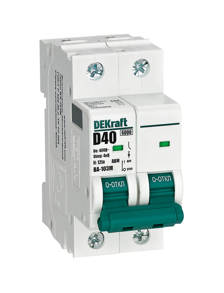 Автоматический выключатель без теплозащиты серии ВА-103M Dekraft; 2P; ном. ток 40 А; ном. раб. напряжение 400 В; кривая отключения D. Автоматические выключатели серии ВА-103М имеют специальное назначение для систем противопожарной защиты и вентиляции и выдерживают ток КЗ до 6000 А. Также они могут использоваться для нечастых оперативных включений и отключений указанных цепей. Автоматические выключатели соответствуют директиве RoHS, имеют расширенный диапазон рабочих температур от -25 до +60 °C, удобны и безопасны в эксплуатации.