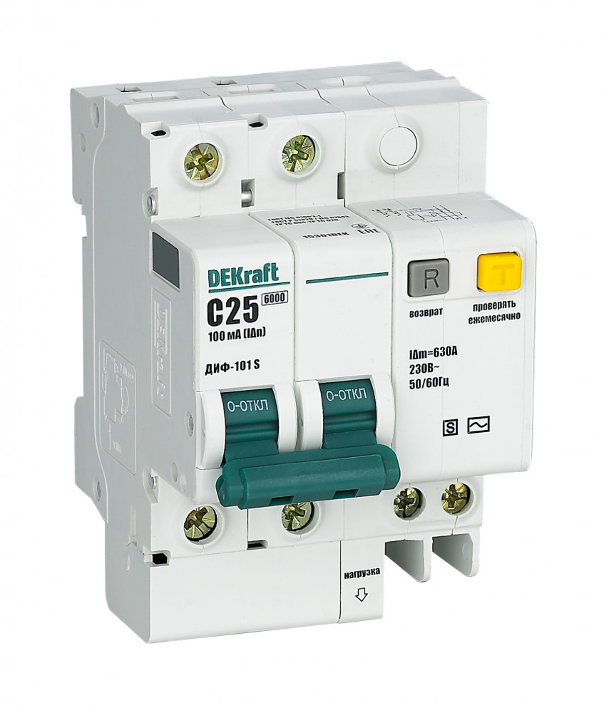 Автоматический выключатель дифференциального тока серии ДИФ-101 S Dekraft; селективный; 2P; ном.ток 25 А; характеристика C; откл.способность Icn = 6 кА; ток утечки 100 мА; блок дифф.защиты – электронный; ширина – 3,5 мод. х 18 мм; монтаж – на DIN-рейку. АВДТ применяются в сетях напряжением до 400 В пер.тока для защиты электроустановок от сверхтоков и токов утечки; в щитах, где требуется ступенчатая дифференциальная защита (задержка по срабатыванию).