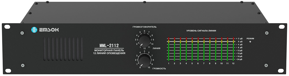 Мониторная панель на 12 линий оповещения. Служит для визуального и аудио контроля линий оповещения. Установка в 19" дюймовую стойку, занимает 2U. Диапазон входного напряжения: 24 В ± 20%. Диапазон рабочих температур : 0...+40 °С. Габаритные размеры: 483x320x88 мм