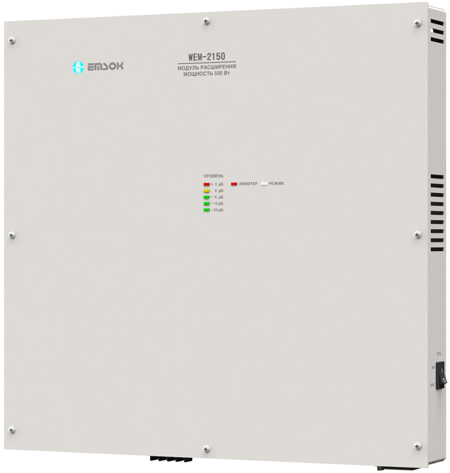 Устройство WEM-2150 российской компании «ЭМСОК» предназначено для работы в составе систем речевого оповещения и управления эвакуацией (СОУЭ). Данный модуль расширения мощностью 500 Вт/выходным напряжением 100 В служит для наращивания мощности и увеличения количества линий систем на базе блоков управления сигналами или настенных станций оповещения марки EMSOK.