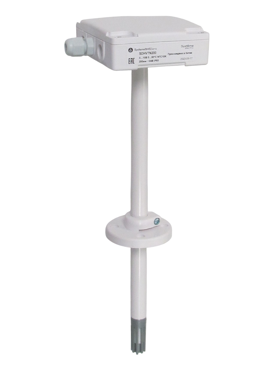 Датчик влажности и температуры канальный, для установки на воздуховод, монтажный фланец и кабельный ввод в комплекте, диапазон измерения влажности 0….100%, выходной сигнал влажности 0…10В, диапазон измерения температуры -40…+80°С, выходной сигнал температуры NTC10K, длина погружной части 283 мм, глубина погружения регулируется от 40 до 265 мм, винтовые клеммы, степень защиты корпуса IP53, электропитание ⎓15…35В