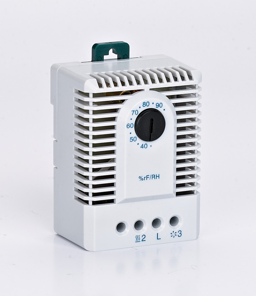Электронный гигростат Dekraft. Диапазон уставок - от 40 до 90% RH. Напряжение питающей сети - до 200-240В В АС. Предназначено для применения совместно с резистивными нагревателями для поддержания требуемого уровня влажности внутри электротехнического шкафа.