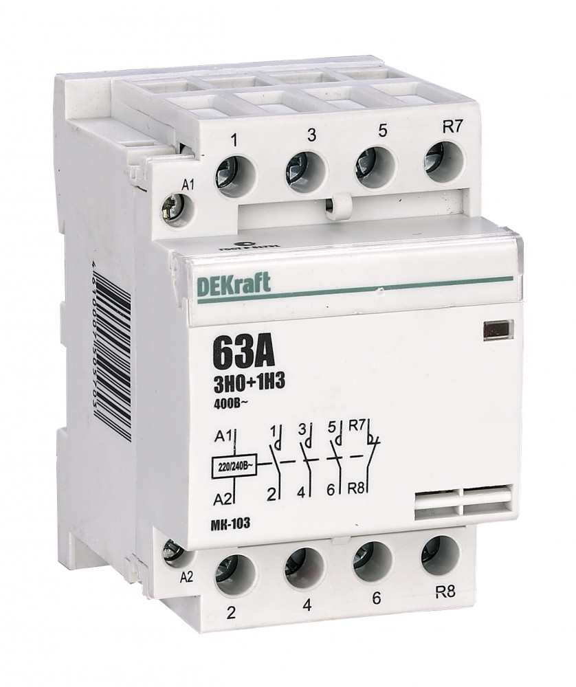 Модульный контактор серии МК-103 Dekraft; ном.ток 40 А (АС-7а); кол-во и исполнение контактов – 4НЗ; напряжение управления 220 В пер.тока; ширина – 3 мод. х 18 мм; установка – на DIN-рейку. Контакторы МК-103 применяются в сетях напряжением до 400 В пер.тока для дистанционного управления небольшими нагрузками, требующими большого количества включений / отключений, например, насосы, системы вентиляции и т.п. Модульные контакторы не требуют дополнительных настроек и специального обслуживания. Продается упаковками по 4 штук