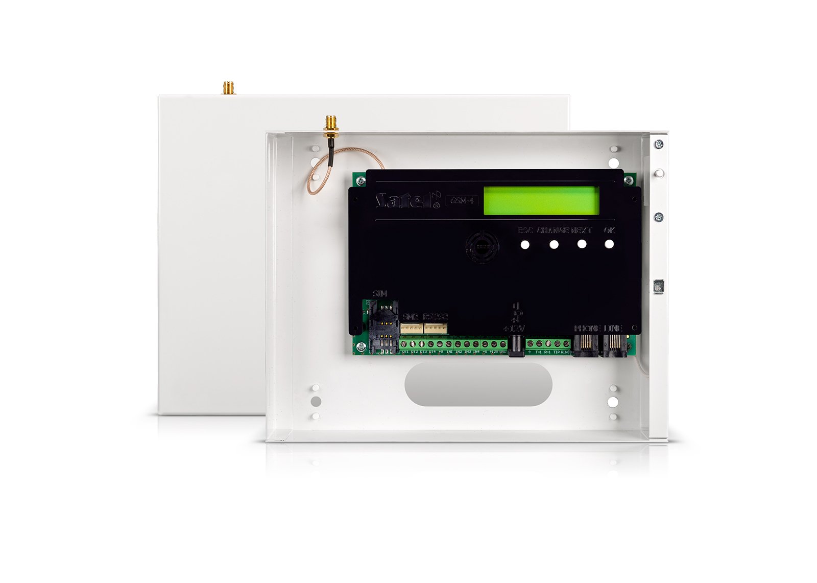ЭЛЕМЕНТ УПРАВЛЕНИЯ АВТОМАТИКОЙ. Коммуникационный модуль сотовой связи GSM, поддержка двух SIM-карт, преобразование телефонных сигналов мониторинга в форматы: SMS, GPRS и CSD, cовместим с любой ПКП, в металлическом корпусе 230х178х42 мм, 4 программируемых входа с возможностью включения оповещения голосового/SMS/ CLIP и отправки событий на ПЦН, 3 выхода с возможностью дистанционного управления DTMF/SMS /CLIP (с мобильного телефона), ЖК дисплей, RS-232, функция «удаленного порта RS-232» через GPRS, имитация аналоговой телефонной линии сотовой сетью, контроль телефонной линии и автоматическое переключение на GSM канал в случае её аварии, преобразование телефонных сигналов мониторинга от любого ПКП в формат для отправки по GPRS каналу, возможность программирования с ПК или с GSM-модуля, возможность удалённого обновления микропрограммы модуля и т.д. Напряжение питания U = 12 В DC, среднее потребление тока I ср.= 250 mA, максимальный ток выходов I max .вых = 50 mA. Диапазон рабочих температур -10 °C...+55 °C