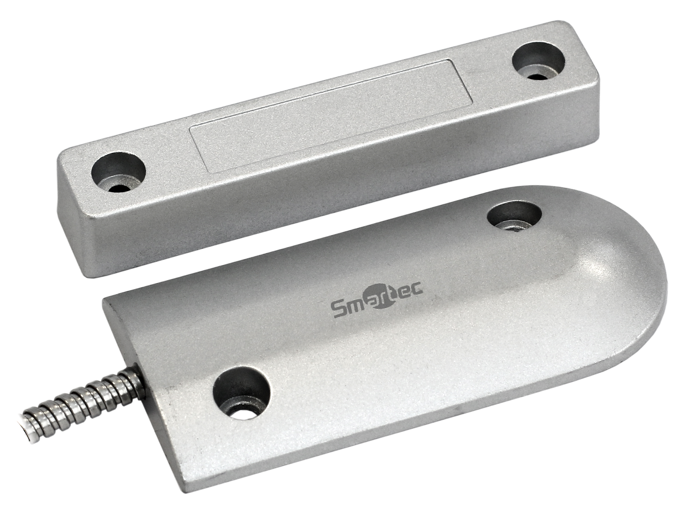 Магнитоконтактный датчик, НЗ, серебряный, накладной для металлических дверей, металлорукав, зазор 60 мм