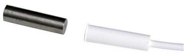 Магнитоконтактный извещатель врезной, пластмассовый корпус (белый), тамперный шлейф, монтаж вдавливанием - без употребления клея или шурупов, кабель 110 см., подключение проводов непосредственно внутри корпуса. Тип извещателей NC, максимальное переключаемое напряжение геркона 20 В, максимальный ток 20 mA, размеры (мм): Ø 7,2, длина 32,6. Диапазон рабочих температур - 30°C...+ 65°C.