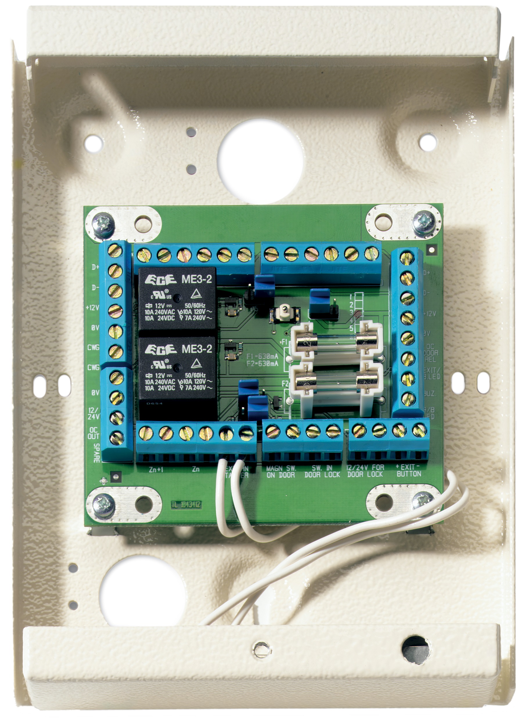 Дверной модуль для подключения считывателей по RS-485, имеет 2 зоны, 2 входа для СМК состояния двери, 1 вход для подключения кнопки запроса на выход, реле управления замком двери (500мА), вход подключения доп источника питания. Диапазон рабочих напряжений 10,5...13,8 VDC. Диапазон рабочих температур: 0…+50°С. Габаритные размеры: 181х129х45 мм.