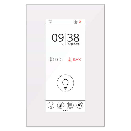 753951 Панель управления Thanos EVO с возможностью измерения и регулирования комнатной температуры, опциональным сенсором влажности и функциональным дисплеем для наглядного отображения измеренных значений. Не требующий обслуживания встроенный сенсор температуры создает условия для приятного климата в помещении и хорошего самочувствия. Комнатный пульт оснащен 4.8-дюймовым дисплеем с высоким разрешением и качественной стеклянной поверхностью. Инновационное и интуитивно понятное управление обеспечивает управление освещением, затенением, климатом и различными сценариями для интеллектуальной автоматизации помещений.