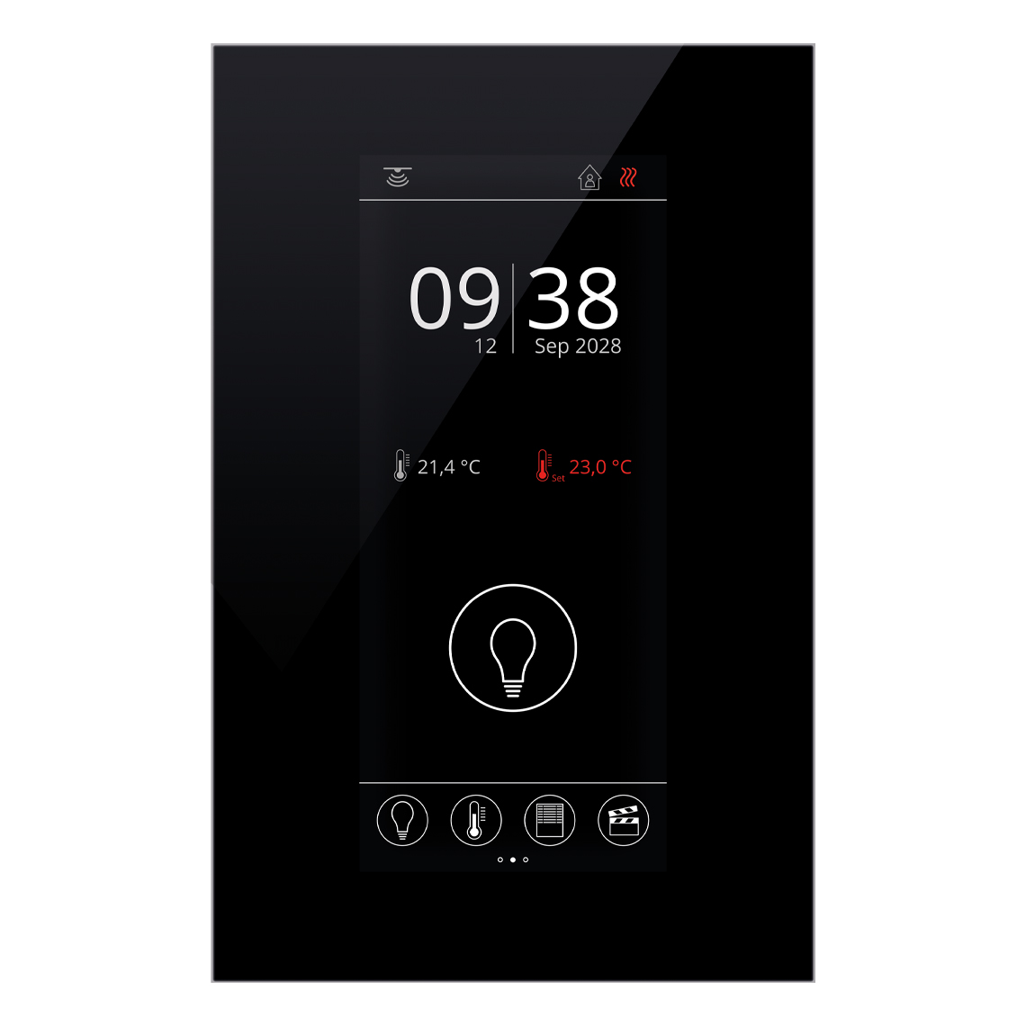 762038 Панель управления Novos 7 с возможностью измерения и регулирования комнатной температуры, опциональным сенсором влажности, CO2 или VOC и функциональным дисплеем для наглядного отображения измеренных значений. Не требующий обслуживания встроенный сенсор температуры создает условия для приятного климата в помещении и хорошего самочувствия. Комнатный пульт оснащен 3.5-дюймовым дисплеем с высоким разрешением и качественной стеклянной поверхностью. Инновационное и интуитивно понятное управление обеспечивает управление освещением, затенением, климатом и различными сценариями для интеллектуальной автоматизации помещений.