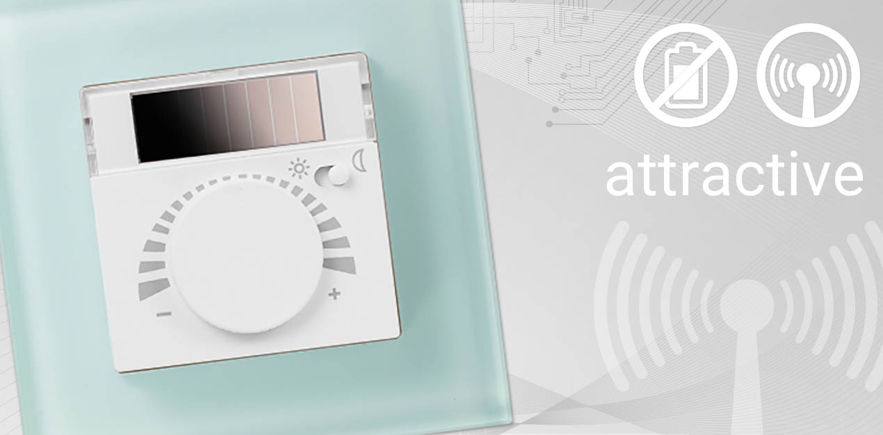 Настенная беспроводная панель управления с интерфейсом EnOcean для измерения температуры и влажности, значением уставки и опциональным переключателем (день/ночь), глянцевый чисто-белытей, без рамки (температура и влажность)
