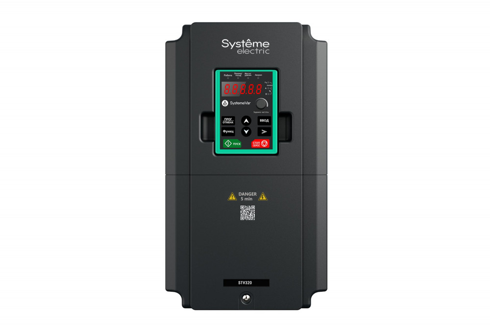 Преобразователь частоты SystemeVar 320 (STV320). Номинальная мощность: 5,5 кВт (G-тип: перегрузочная способность: 150% в течение 60с, 180% в течение 10с, 200% в течение 1с. Несущая частота ШИМ: 8 кГц). Номинальный ток: 14 А (G-тип). Питающее напряжение 3Ф 380В (-15%) ~ 440В (+10%). Степень защиты IP20. Габаритные размеры (ДхШхВ), мм: 146х167х256. Вес: 3,1 кг.