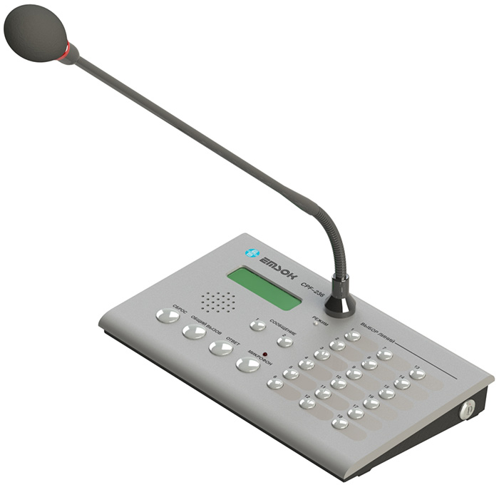 Пульт управления системой оповещения на 56 линий с микрофоном на гибком держателе. Подключается к БУСам MPU-20xx по линии RS-485. Диапазон входного напряжения: 24 В ± 20%. Диапазон рабочих температур : 0...+40 °С.