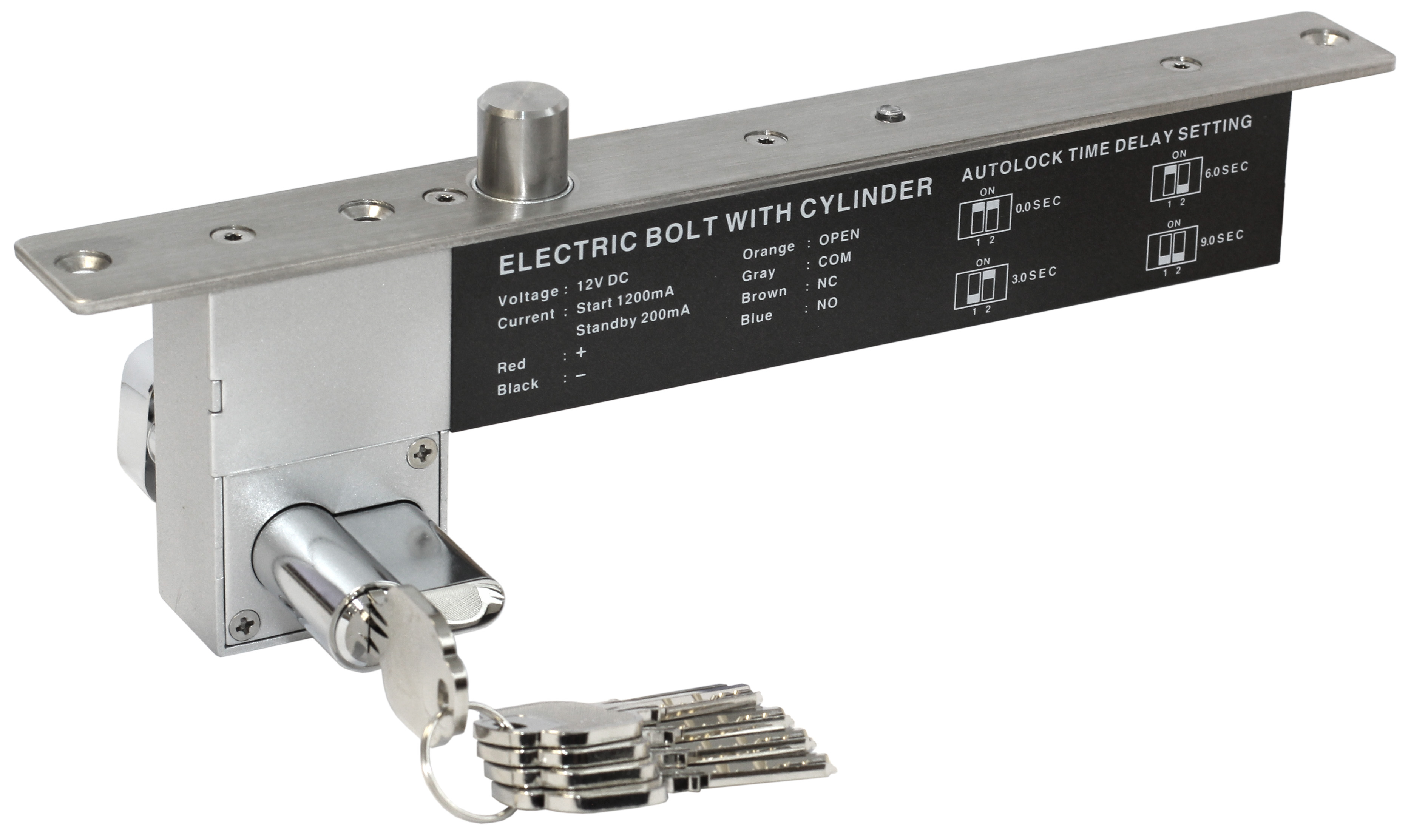 Эл-мех. соленоидный замок для сплошных дверей с механическим цилиндром (ключ/поворотная кнопка), мониторинг, НЗ, питание 12VDC / 200мА (пик 1200мА), цельнометаллический ригель, сила удержания 2000кг