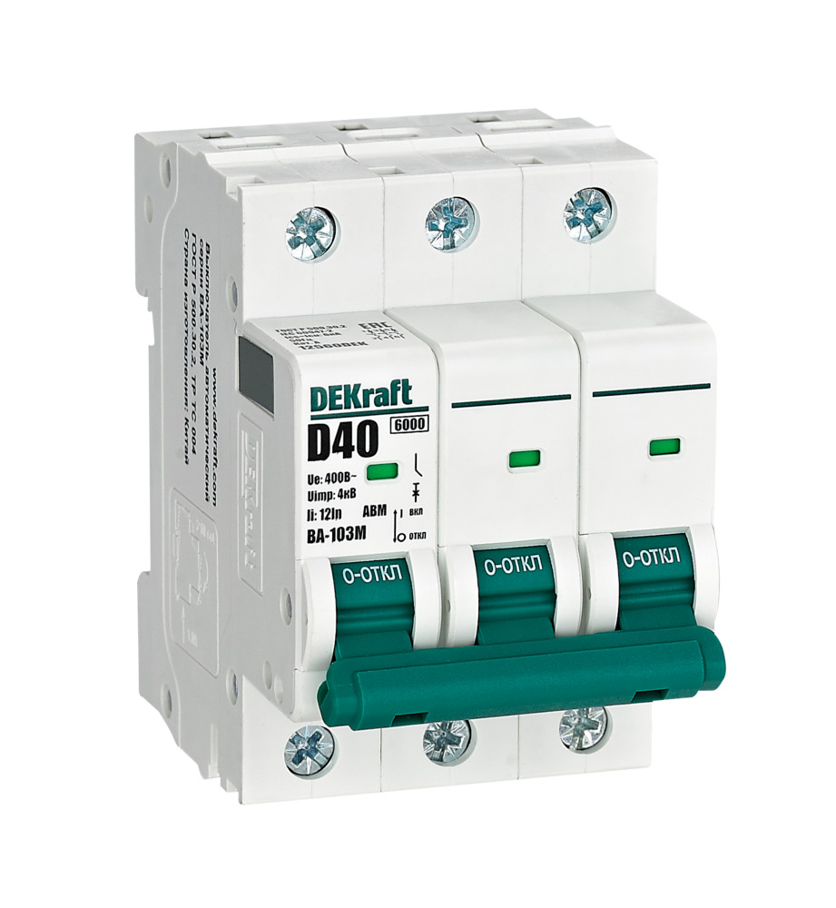 Автоматический выключатель без теплозащиты серии ВА-103M Dekraft; 3P; ном. ток 40 А; ном. раб. напряжение 400 В; кривая отключения D. Автоматические выключатели серии ВА-103М имеют специальное назначение для систем противопожарной защиты и вентиляции и выдерживают ток КЗ до 6000 А. Также они могут использоваться для нечастых оперативных включений и отключений указанных цепей. Автоматические выключатели соответствуют директиве RoHS, имеют расширенный диапазон рабочих температур от -25 до +60 °C, удобны и безопасны в эксплуатации.