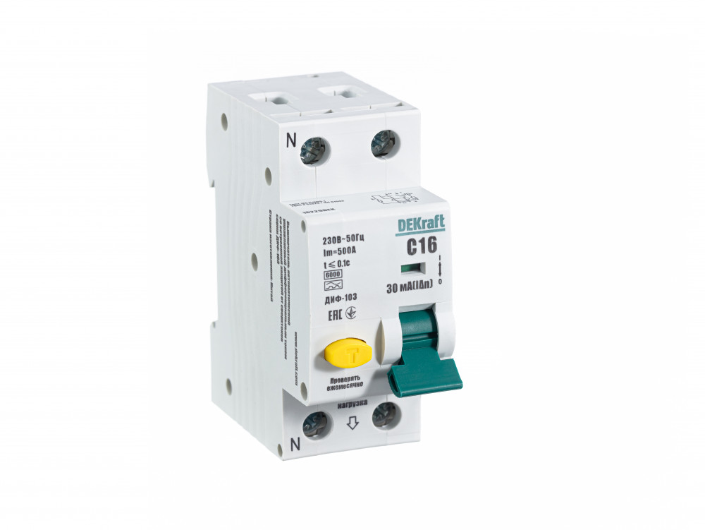 Автоматический выключатель дифференциального тока серии ДИФ-103 Dekraft; 1P+N; ном.ток 16 А; характеристика C; откл.способность Icn = 6 kA; ток утечки 30 мА; тип - А; блок дифф.защиты – электронный; ширина – 2 мод. х 18 мм; монтаж – на DIN-рейку. АВДТ применяются в сетях напряжением до 220 В пер.тока для защиты человека от поражения электрическим током и электроустановок от сверхтоков и токов утечки. Аппараты ДИФ-103 являются более компактным вариантом АВДТ по сравнению с серией ДИФ-101.
