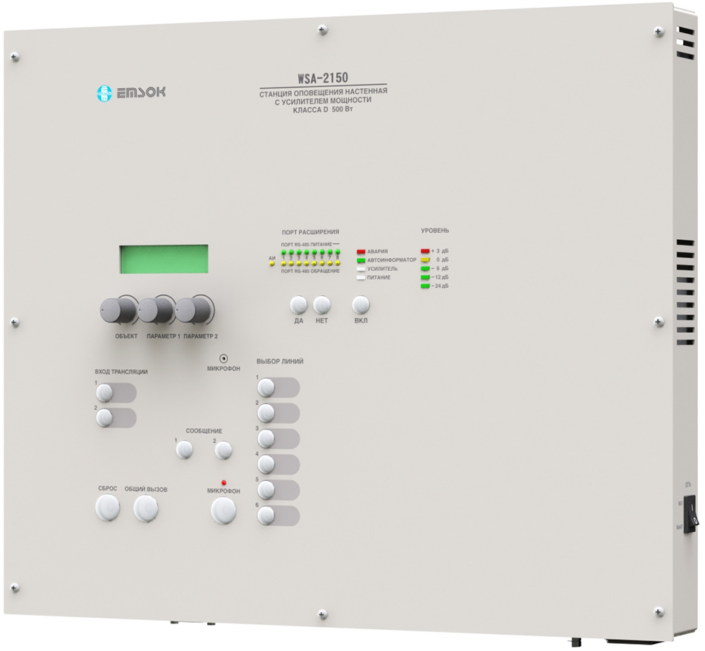 Настенная моноблочная станция оповещения со встроенным усилителем 100 В/360 Вт. Содержит в едином корпусе контроллер, усилитель мощности класса D, коммутатор, микрофон и пульт управления. 6 линий оповещения на борту (расширяется до 64). Для увеличения мощности и/или кол-ва линий оповещения необходимо подключить дополнительные модули расширения серии WEM. Диапазон входного напряжения: 230 В +10%/-15%. Диапазон рабочих температур : 0...+40 °С. Габаритные размеры: 431x355x75 мм
