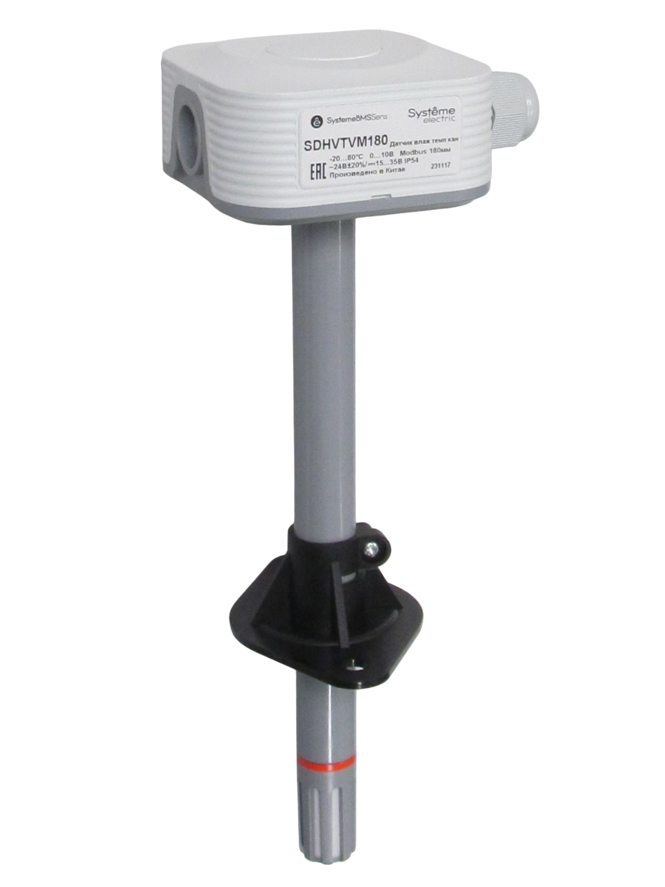 Датчик влажности и температуры канальный, для установки на воздуховод, монтажный фланец и кабельный ввод в комплекте, 0…10В, диапазон температуры -20…+80°C, подключение RS-485 Modbus RTU, винтовые клеммы, длина погружной части 180 мм, глубина погружения 40…155 мм, степень защиты корпуса IP54, напряжение питания 24 В переменного тока или 15…35 В постоянного тока