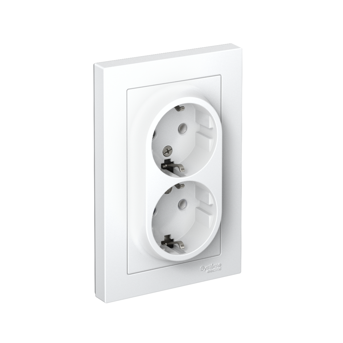 Розетка двойная в сборе Systeme Electric (ранее Schneider Electric) серии AtlasDesign в цвете белый с заземлением, без шторок подходит для сетей 250 В, на ток 16 А. Пластик с ионами серебра обеспечивает антибактериальный эффект. Заземляющий контакт обеспечивает дополнительную защиту от удара электрическим током. Лицевые детали из качественного ABS-пластика, устойчивого к царапинам и УФ-излучению. Двойная розетка позволяет подключить два устройства в одном месте. Изделие поставляется в комплекте с рамкой того же цвета. Продается упаковками по 10 штук