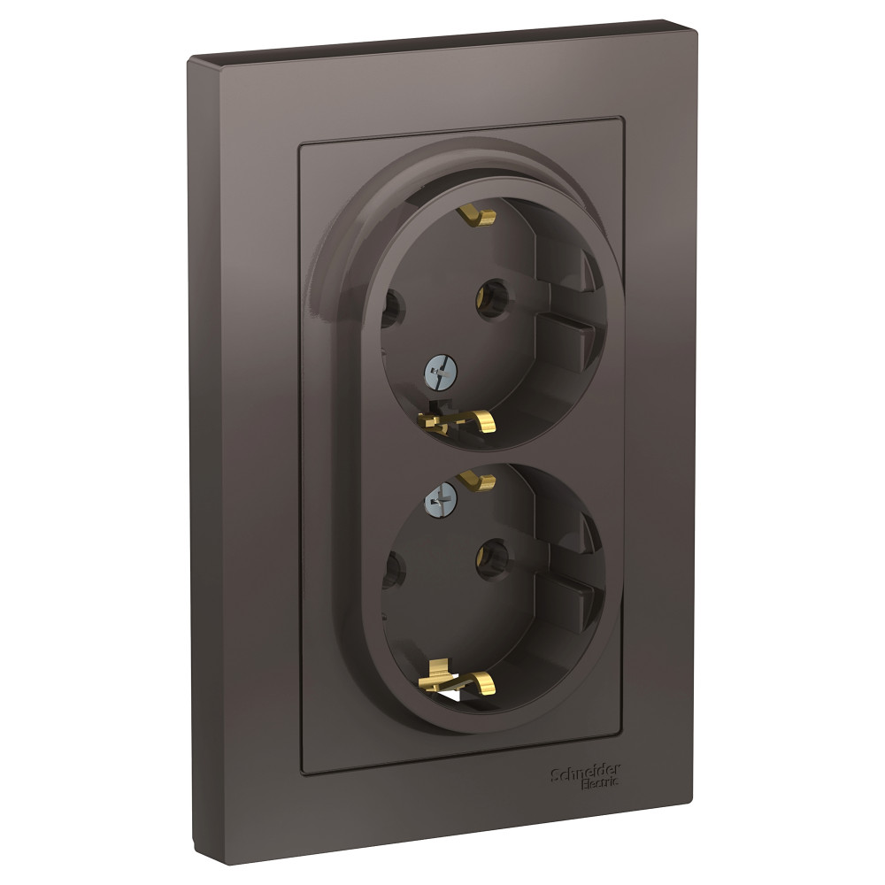 Розетка двойная Systeme Electric (ранее Schneider Electric) серии AtlasDesign (в сборе, цвет мокко) с заземлением и шторками подходит для сетей 250 В, на ток 16 А.