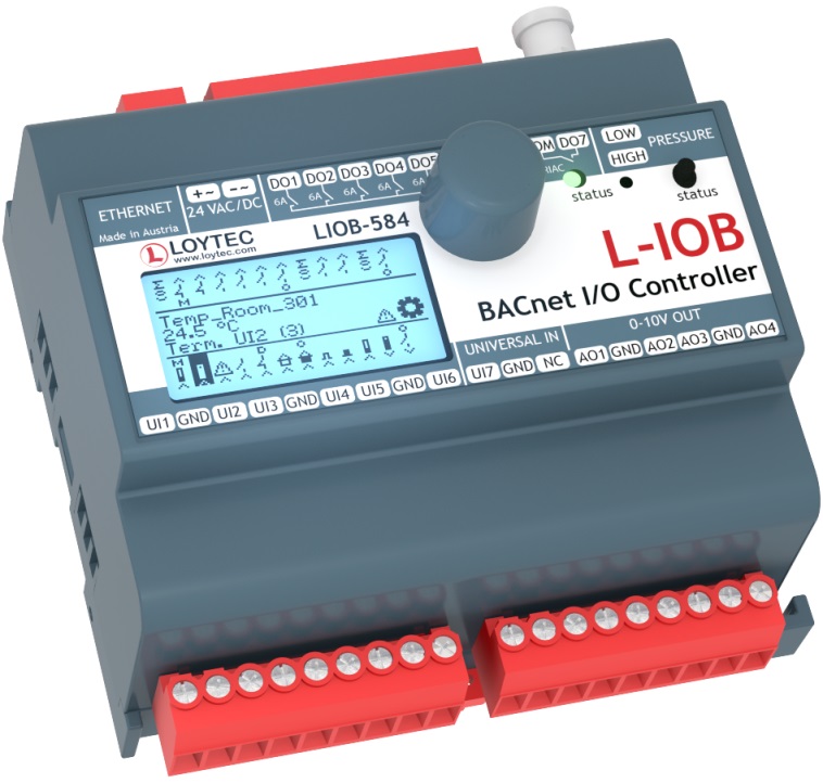 LIOB-584 Программируемый контроллер, BACnet/IP, 7 UI, 4 AO, 7 DO (5 x Реле 6 A, 2 x Triac 1 A), 1 Датчик Давления