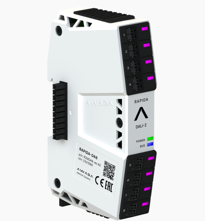 Модуль RAPIDA-DA8 российской компании «Авада Системс» обеспечивает подключение к интеллектуальной системе управления освещением AWADA до восьми независимых двухпроводных линий, поддерживающих протокол управления DALI. Управление и получение данных от устройств стандарта DALI осуществляется с помощью данного модуля, выступающего в роли посредника между контроллером RAPIDA-C или шлюзом RAPIDA-G и исполнительными устройствами.