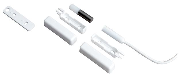 Магнитоконтактный извещатель накладной, пластмассовый корпус (белый), поверхностный монтаж, клеевая основа для монтажа, кабель 36 см, без крепежных винтов, с резисторами. Состоит из 2-х элементов: магнитоконтактного датчика (геркона) и магнита. Тип извещателей (конфигурация) 2ЕOL/NC, оконечные резисторы (встроенные) 2х1,1кΩ, максимальное напряжение геркона U max.гер.= 20 В, максимальный ток I max.= 20 mA, расстояние замыкания контактов геркона - 18 мм, расстояние размыкания контактов геркона - 28 мм, размеры (мм): длина 24,2, ширина 7,2, масса 10 гр. Диапазон рабочих температур - 30°C...+ 65°C.