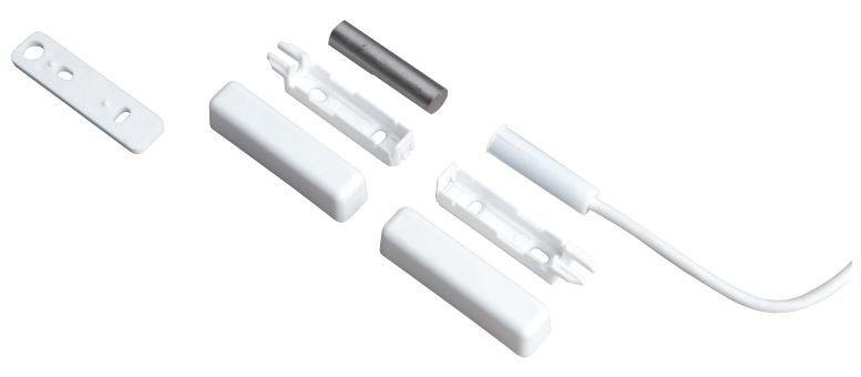 Магнитоконтактный извещатель накладной, пластмассовый корпус (белый), поверхностный монтаж, клеевая основа для монтажа, кабель 36 см, без крепежных винтов, с резисторами. Состоит из 2-х элементов: магнитоконтактного датчика (геркона) и магнита. Тип извещателей (конфигурация) 2ЕOL/NC, оконечные резисторы (встроенные) 2х1,1кΩ, максимальное напряжение геркона U max.гер.= 20 В, максимальный ток I max.= 20 mA, расстояние замыкания контактов геркона - 18 мм, расстояние размыкания контактов геркона - 28 мм, размеры (мм): длина 24,2, ширина 7,2, масса 10 гр. Диапазон рабочих температур - 30°C...+ 65°C.
