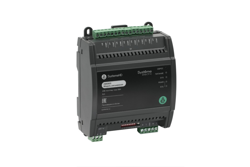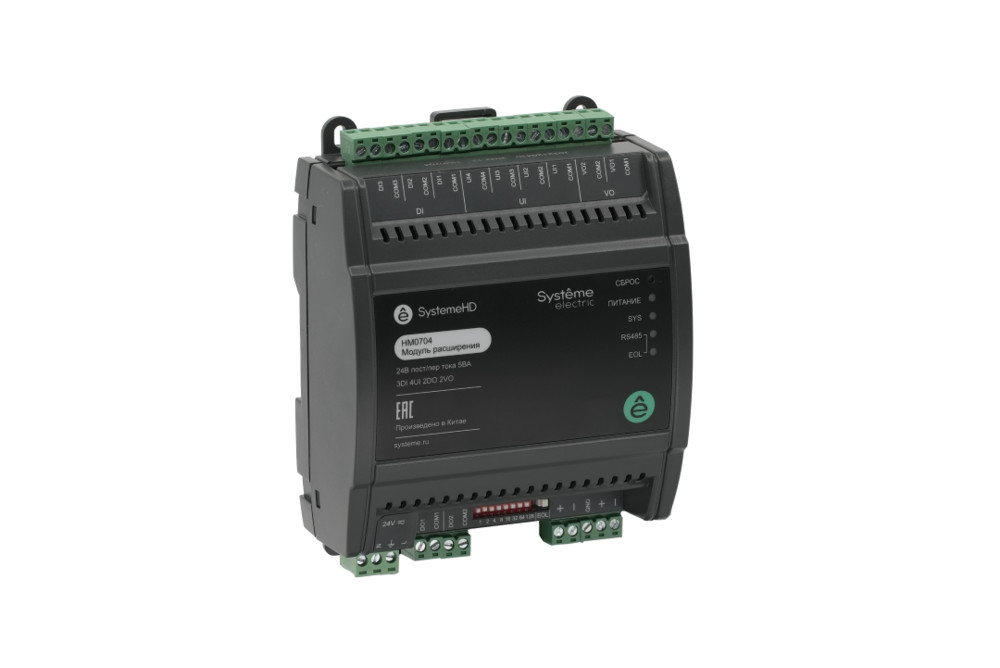 Модуль расширения SystemeHD, 8 универсальных входов, индивидуально конфигурируемых как дискретный вход, вход термосопротивления RTD, аход напряжения 0…10 В или вход тока 4…20 мА, порт RS485, Modbus RTU Slave или BACnet MS/TP, напряжение питания 24 В переменного или постоянного тока