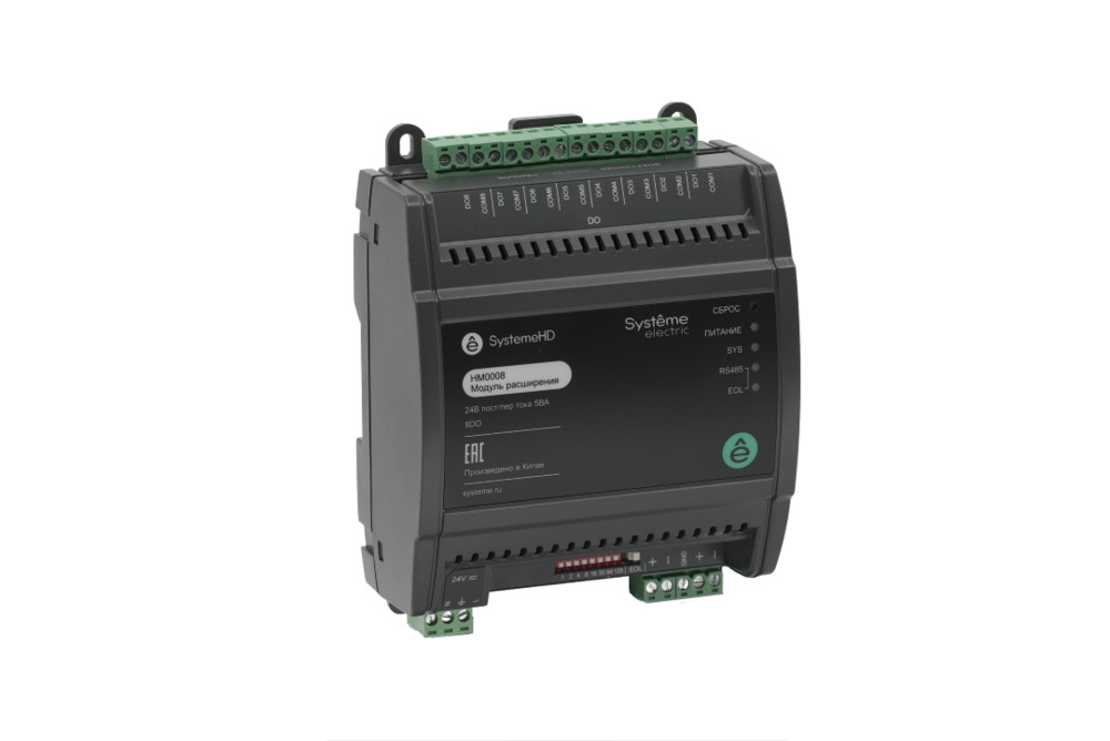 Модуль расширения серии SystemeHD, 8 дискретных релейных выходов, один порт RS485, Modbus RTU Slave или BACnet MS/TP, напряжение питания 24 В переменного или постоянного тока
