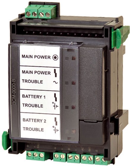 Модуль контроллера батарей. Контролирует питание всей контрольной панели. Он управляет процессом зарядки 4 АКБ. Два выхода 24в/2,8A каждый. Три выхода неисправности (AC, DC, общая неисправность). Габаритные размеры: 127х96х60 мм. Диапазон рабочих температур: -5...+50 °С. Степень защиты IP30. В комплекте два соединительных кабеля: BCM/батарея (90 см) и батарея/батарея (17 см)