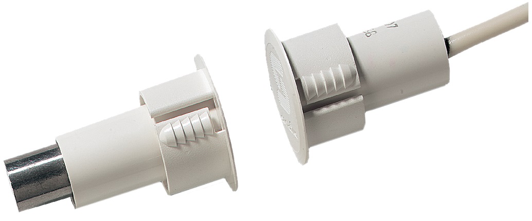 Неадресный магнитоконтактный извещатель для металлических дверей, врезной монтаж, тамперный контакт, НЗ/НО-контакт, рабочий зазор 12 мм, кабель длиной 2м, белый. Габаритные размеры: 30х39 мм