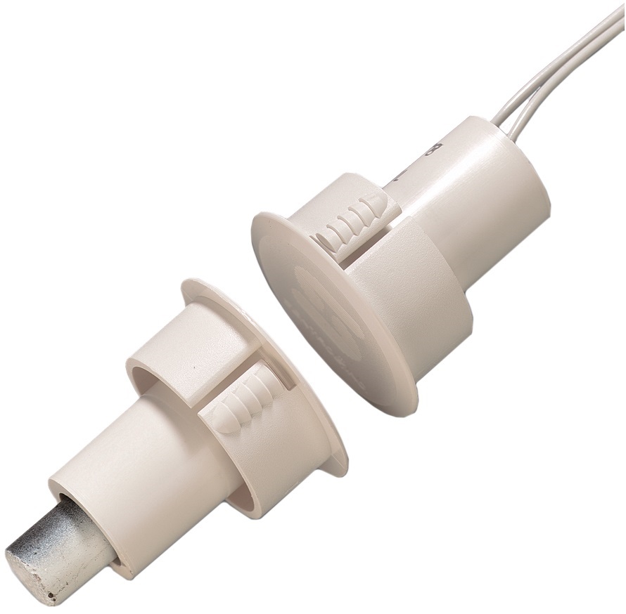 Неадресный магнитоконтактный извещатель для металлических дверей, врезной монтаж, тамперный контакт, НЗ-контакт, рабочий зазор 19 мм, кабель длиной 30 см, белый. Габаритные размеры магнит: 19х40 мм, геркон: 19х29 мм.