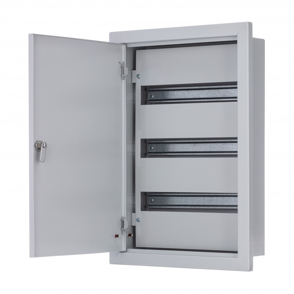 Щит распределительный серии ЩРВ Dekraft; встраиваемый; номинальный ток до 125 А; исполнение – 54 мод. х 18 мм, 3 ряда по 18 мод. каждый; ВхШхГ - 550х430х120 мм; материал – сталь; цвет - серый (RAL 7035); степень защиты - IP31. Щиты ЩРВ имеют встроенные DIN-рейки для модульной аппаратуры, элементы крепления шин N и PE, болты заземления на дверце и на корпусе, дверь с замком и ключом. Доступ к токопроводящим частям закрыт съемной фальшпанелью. Ввод кабелей осуществляется сверху или снизу.