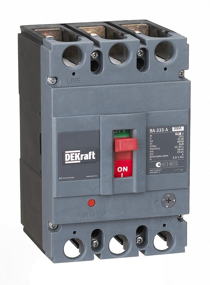 Автоматический выключатель серии ВА-333 Dekraft; 3P; номинальный ток 200 А, отключающая способность Icu = 50 кА (при 415 В 50 Гц); расцепитель – термомагнитный, регулируемый. В комплект поставки входят 4 межфазные перегородки и крепеж на монтажной плате. В дополнение к выключателям выпускается ряд аксессуаров, расширяющих их функционал: сигнальные контакты, расцепители напряжения, моторные приводы, шины выносные и др.