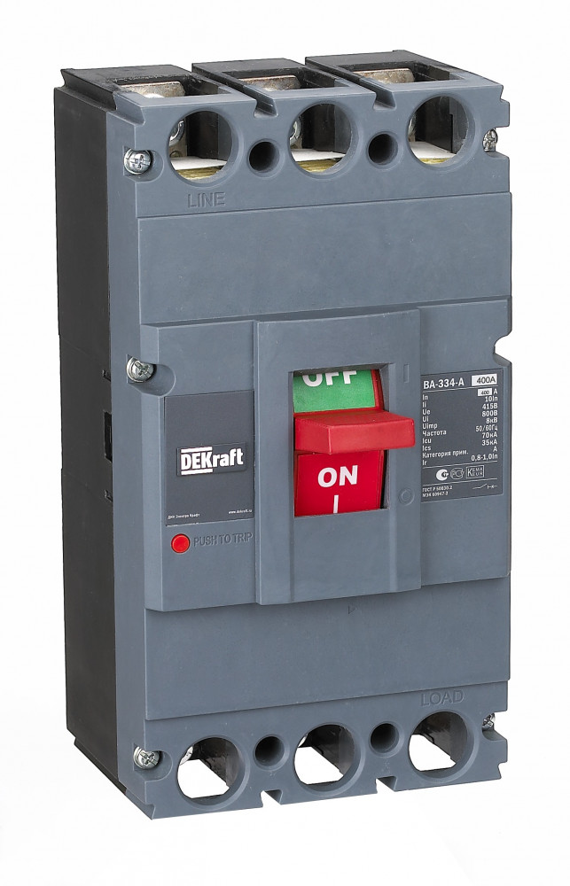 Автоматический выключатель серии ВА-334 Dekraft; 3P; номинальный ток 400 А, отключающая способность Icu = 70 кА (при 415 В 50 Гц); расцепитель – термомагнитный, регулируемый. В комплект поставки входят 4 межфазные перегородки и крепеж на монтажной плате. В дополнение к выключателям выпускается ряд аксессуаров, расширяющих их функционал: сигнальные контакты, расцепители напряжения, моторные приводы, шины выносные и др.