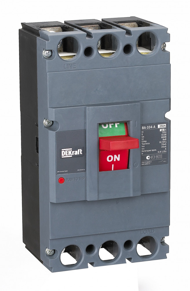 Автоматический выключатель серии ВА-334 DEKraft; 3P; номинальный ток 250 А, отключающая способность Icu = 70 кА (при 415 В 50 Гц); расцепитель - термомагнитный, регулируемый. В комплект поставки входят 4 межфазные перегородки и крепеж на монтажной плате. В дополнение к выключателям выпускается ряд аксессуаров, расширяющих их функционал: сигнальные контакты, расцепители напряжения, моторные приводы, шины выносные и др.