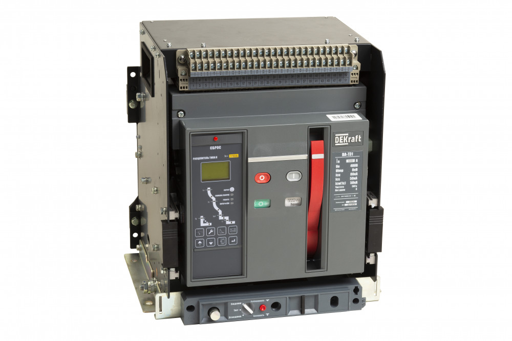 Воздушный автоматический выключатель серии ВА-731 DEKraft; 3P; номинальный ток 800 А; отключающая способность 80 кА, выкатной, блок управления типа H; присоединения задние горизонтальные. В базовую комплектацию входят моторный привод (230 В пер.тока), 4 контакта состояния ВКЛ/ОТКЛ, сигнальный контакт, электромагнит включения (230 В пер.тока), независимый расцепитель (230 В пер.тока), сигнальный контакт положения аппарата в корзине, разделители полюсов и рамка передней панели. Выключатели с блоком управления типа H позволяют осуществлять мониторинг и диспетчеризацию защищаемой сети и нагрузок.